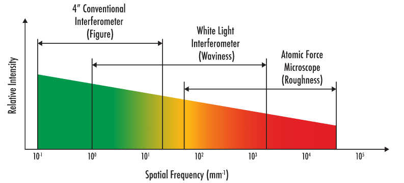 Conventional interferometry is ideal for measuring low spatial frequency errors. This class of surface errors is referred to as figure errors and is associated with typical Zernike polynomials. Zernike polynomials describe errors caused by wavefront aberrations as an optical component deviates from an ideal shape. A white light interferometer is best suited to measure waviness or mid-range spatial frequency errors. Waviness is often attributed to creating effects such as hazing and decreased contrast. Finally, the atomic force microscope provides the best resolution for high-frequency spatial errors which characterize the roughness of the optical surface. There are some overlaps in these groups, as both the white light interferometer and the atomic force microscope can be used to measure roughness. The correct choice of equipment will be partially dependent on the wavelength of the application. For example, WLI is ideal when measuring visible or IR spectra as they are typically analyzed at frequencies less than 2,000 cycles/mm.
