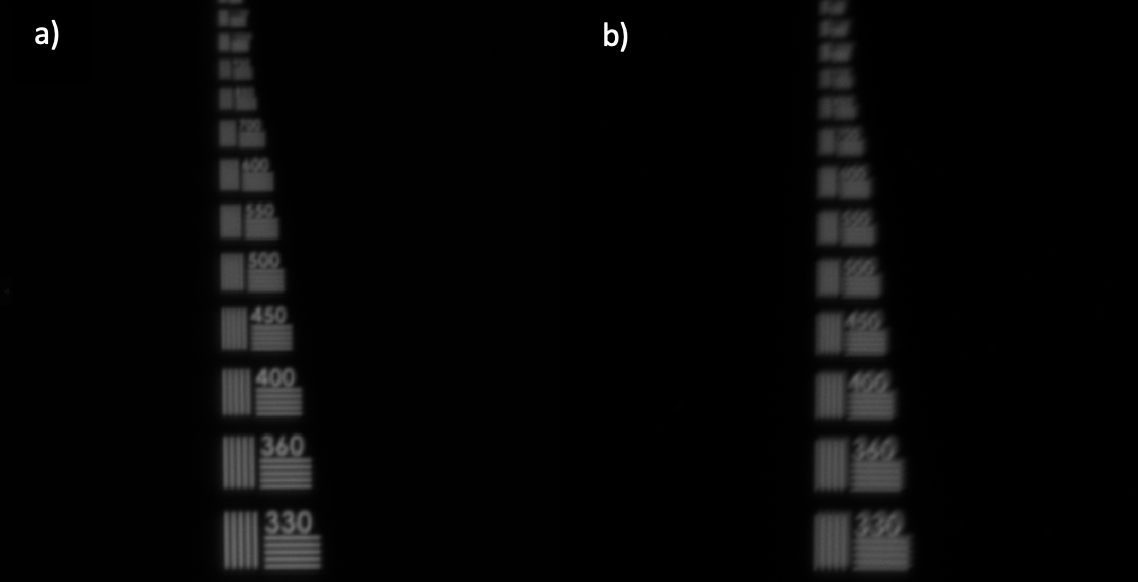 a) Image with 5X 120i Plan APO Infinity Corrected Objective showing 20% contrast at 330 lp/mm