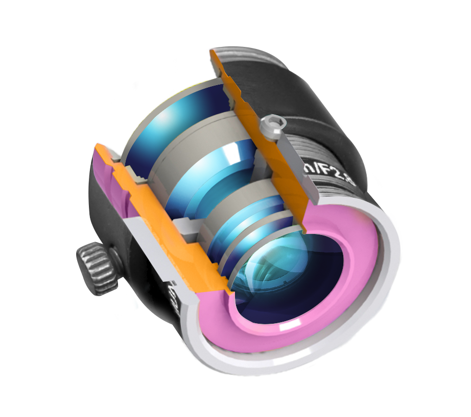 Adjustable irises are swapped for fixed aperture stops and bulky barrel-based focusing mechanisms are replaced with a single thread. These modifications are also the foundation for the other types of ruggedization and improve product lifetime. Industrial ruggedization lenses are ideal for factory automation environments where vision systems are subjected to repeated acceleration and motion.