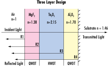Figure 1: In a three-layer broadband anti-reflection (BBAR) coating, the correct choice of λ/4 and λ/2 thicknesses of coatings results in a high transmission and low reflection loss