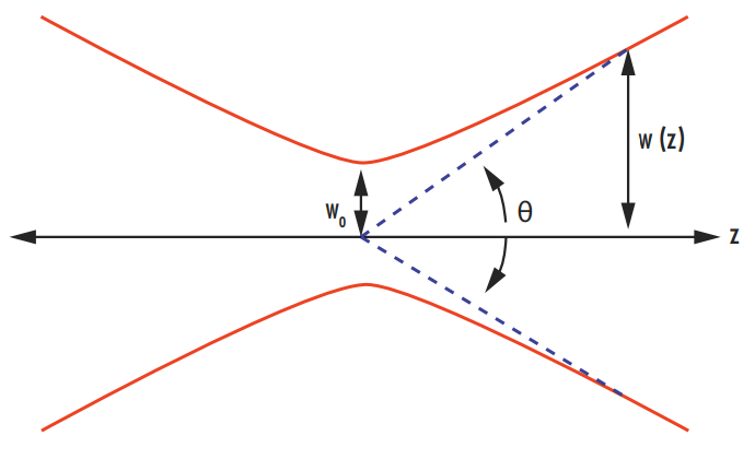 In Equation 1, w0 is the beam waist, θ is the divergence angle of the laser, and λ is the lasing wavelength (Figure 1). As defined in our Gaussian Beam Propagation application note, the divergence angle of a Gaussian beam is determined by the following equation: