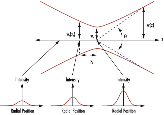 Figure 2: Gaussian beams are defined by their beam waist (w0), Rayleigh range (zR), and divergence angle (θ)