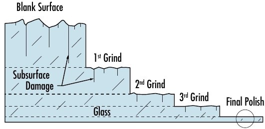 The grinding and polishing process leaves subsurface damage about 0.1µm to tens of microns below the polishing redepostition layer, or the Beilby layer. The redisposition layer is a top layer of the optic that is reflowed over fine surface scratches due to a chemical reaction during the polishing.2 Every grinding and polishing step seeks to remove enough material to reach the deepest subsurface damage from previous steps, decreasing the depth of damage to what is expected to be caused by that current step. Every subsequent step will remove less material (Figure 1).