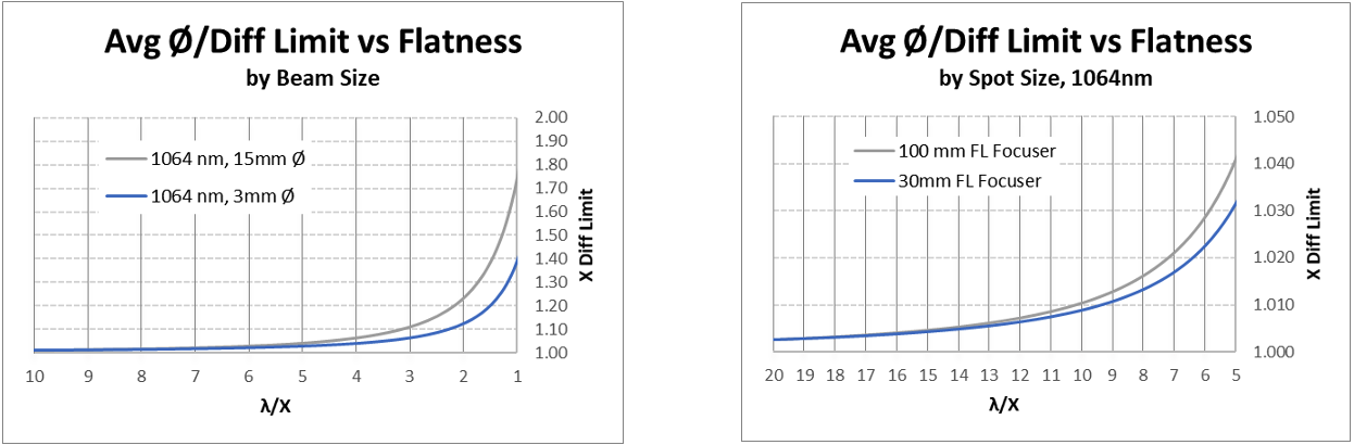 Figure 3: Resulting average spot Ø ÷ diffraction limited Ø vs flatness specification after seven mirror reflections by input beam diameter (left) and by focused spot size (right). The larger beam requires larger mirrors; therefore the absolute mirror flatness is different for each system. In both cases, the error ratio is near unity by λ/5 and virtually diffraction limited out to λ/10. Gains beyond λ/10 are quite small in this example system.For the 15mm beam system, the mirrors are 50.8mm Ø as required to contain the beam. The 3mm beam system can use 12.7mm Ø mirrors, both sizes having 90% $CA$. These plots illustrate a tradeoff at play. The smaller mirrors have 16X higher absolute power error due to a smaller radius of curvature per Equation 7, but interact with less beam area due to the relatively smaller beam. Thus, for a given wavelength, flatness specifications of $λ/10$ or better, regardless of mirror size, have practically indistinguishable effects if appropriately sized for the intended beam.