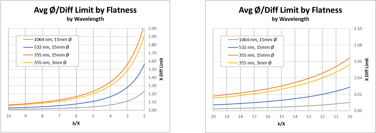 Shorter wavelengths are, however, more sensitive to mirror flatness overall. Recall that $λ$ in the above relations is the test wavelength, typically the HeNe laser line 632.8nm. So, when used with a laser at ½ the test wavelength, the effect of flatness error on the wavefronts will be twice as great. Figure 4 illustrates these characteristics where we see a spot Ø error of 1.02 X the diffraction limit could be achieved with $λ/5$ for 1064nm, but would require $λ/20$ for 355nm.