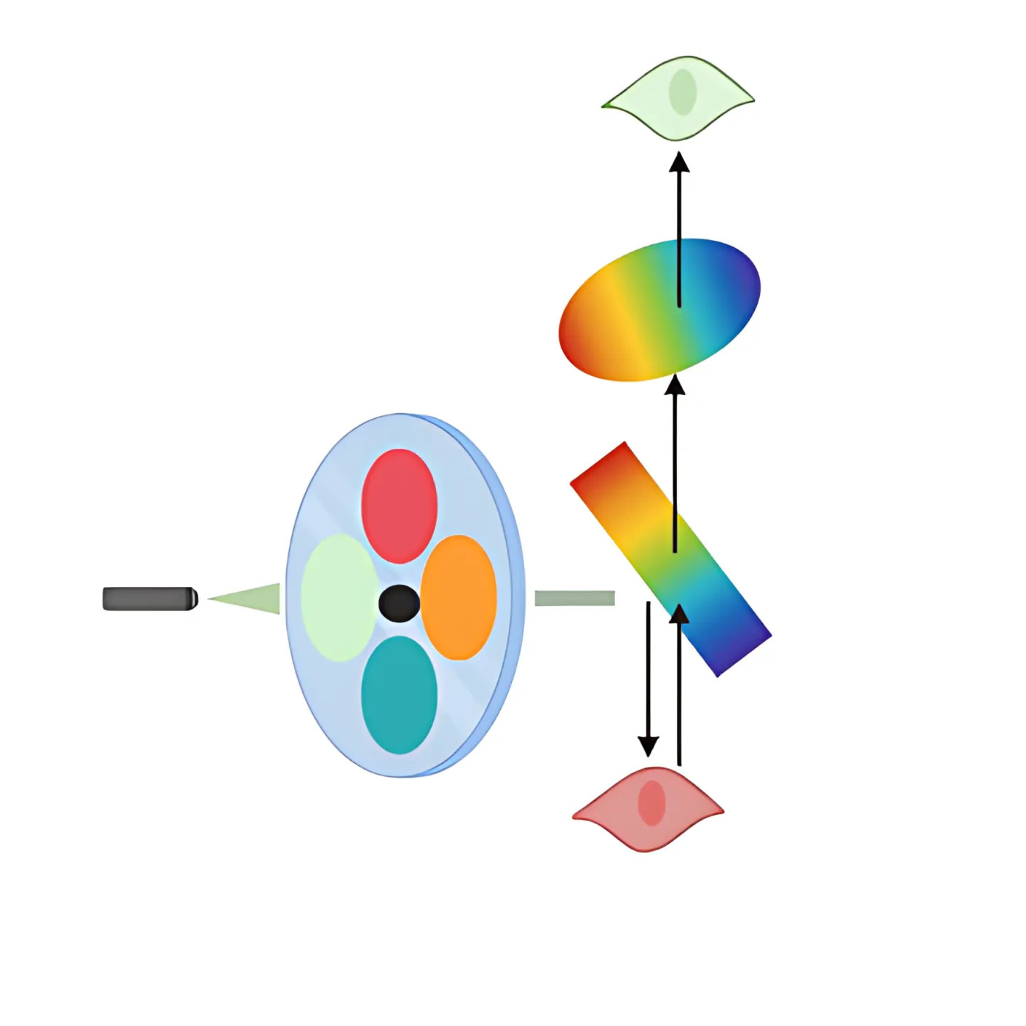 - Pinkel Configuration: Uses single-band excitation filters (typically in a filter wheel or multi-LED system) in conjunction with a multiband dichroic and emission filter. This configuration allows for rapid switching between fluorophores with few moving parts and is ideal for high-speed imaging applications. However, because all emission wavelengths are collected using the same multiband emission filter, spectral bleed-through may occur.