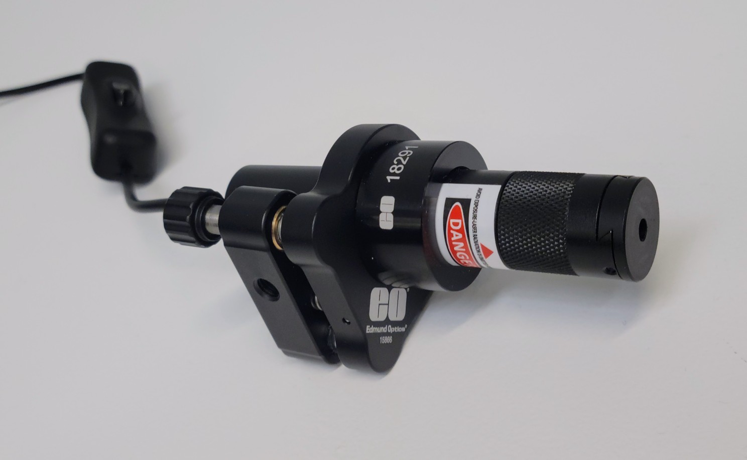 For the laser assembly, mount the E-Series ID Adapter into the E-Series Kinematic Mount and then insert the laser and tighten the set screw, as shown in Figure 4. The laser with stock number 26-938 recommended in the table above is sold as 10mW. For safety reasons, you can use the laser software to reduce the output power to only 1mW. When considering options, you might find that a red diode laser or a comparable low-power laser like stock number 72-817 is also a suitable choice based on availability and budget constraints. It is worth noting that diode lasers possess adequate coherence for educational demonstrations, as you will see in this experiment. Figure 5 shows the laser assembly mounted to a post.