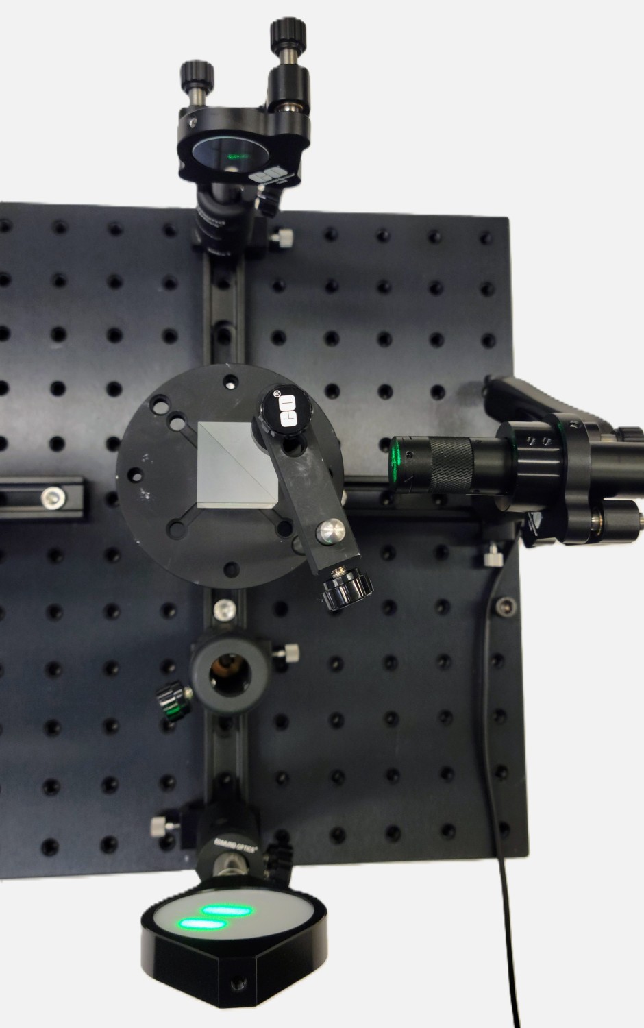 When the two mirrors are perfectly aligned such that their surfaces are exactly perpendicular to each other, the optical path differences across the mirror surfaces remain constant. As a result, the observer sees an interference pattern consisting of concentric rings or fringes. When one of the mirrors is moved along the rail, the path length changes, causing the fringes to shift. This shift in the interference pattern can be used to measure changes in optical path length. If a gas cell is inserted into one of the arms, the pattern shift can be analyzed to determine the refractive index of the gas. The refractive indices of other materials can also be measured using similar principles, although the setup and measurement procedures become more complex. For measurement of the wavelength, use the following equation: λ=2⋅Δd / N, where λ is the unknown wavelength, Δd is the mirror displacement and N is the number of observed bright or dark fringes.