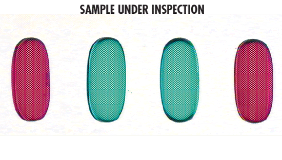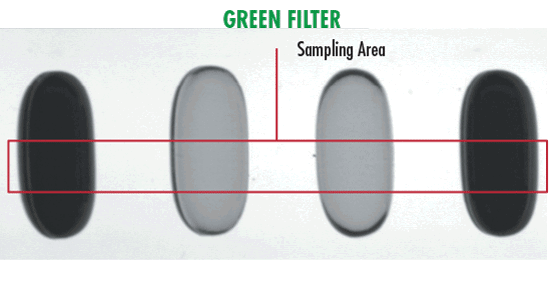 Monochrome cameras cannot inherently differentiate different colors. However, the addition of a color filter greatly increases the contrast between objects. A good rule of thumb is that a given color filter will lighten objects of the same color, while darkening objects of opposing colors. Consider an example where two red and two green pills are imaged with a monochrome camera. Figures 9a - 9d show actual images of a sample under inspection and various images using color filters. It is clear to see that with no filter (Figure 9b), the monochrome camera cannot distinguish between red and green. It would be impossible to inspect these pills on a factory floor. On the other hand, when a red filter is used (Figure 9c), objects of its opposing color (i.e. the green pills) appear gray due to increased image contrast and can be easily discerned from the red pills. Conversely, when a green filter is used (Figure 9d), the red pills appear gray.