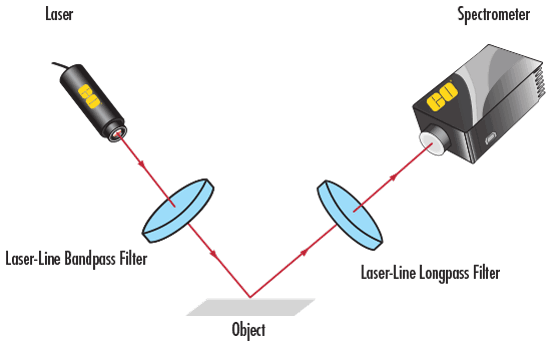 The results in a Raman spectroscopy application can be greatly improved by the use of a few select filters: laser line bandpass, rugate notch, or laser line longpass. To achieve the best results, use filters with bandwidths as narrow as 1.2nm and optical densities of OD 6.0. The laser line bandpass filter is placed in the optical path between the laser and the sample. This ensures that any external ambient light is blocked and only the laser line wavelength is passed. After the light is incident on the sample, it is shifted due to Raman scattering and contains many low intensity modes or signals. Therefore, it becomes very important to block the high intensity laser light through the use of a notch filter centered as close as possible to the laser wavelength. If Raman excitation modes occur very close to the laser line, then a laser line long pass filter can be used as an effective alternative. Figure 10 illustrates a typical Raman spectroscopy setup.