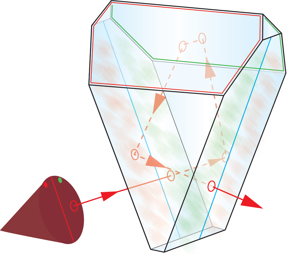 An illustration of this is shown in Figure 5, where the portion of the (diverging) beam that enters the “green” half of the prism is reflected on the back roof surface outlined in green, then falls onto the front roof surface, outlined in red. Light entering the “red” half of the prism will go through in the opposite order. For most given polarization directions of the incident light, the projections of the polarization vector differ between the two surfaces, and so will the induced phase shift when the order of reflection is reversed. Detailed calculations, averaged over all possible polarization directions – as with natural, unpolarized incident light – reveal a net phase shift between the two paths.