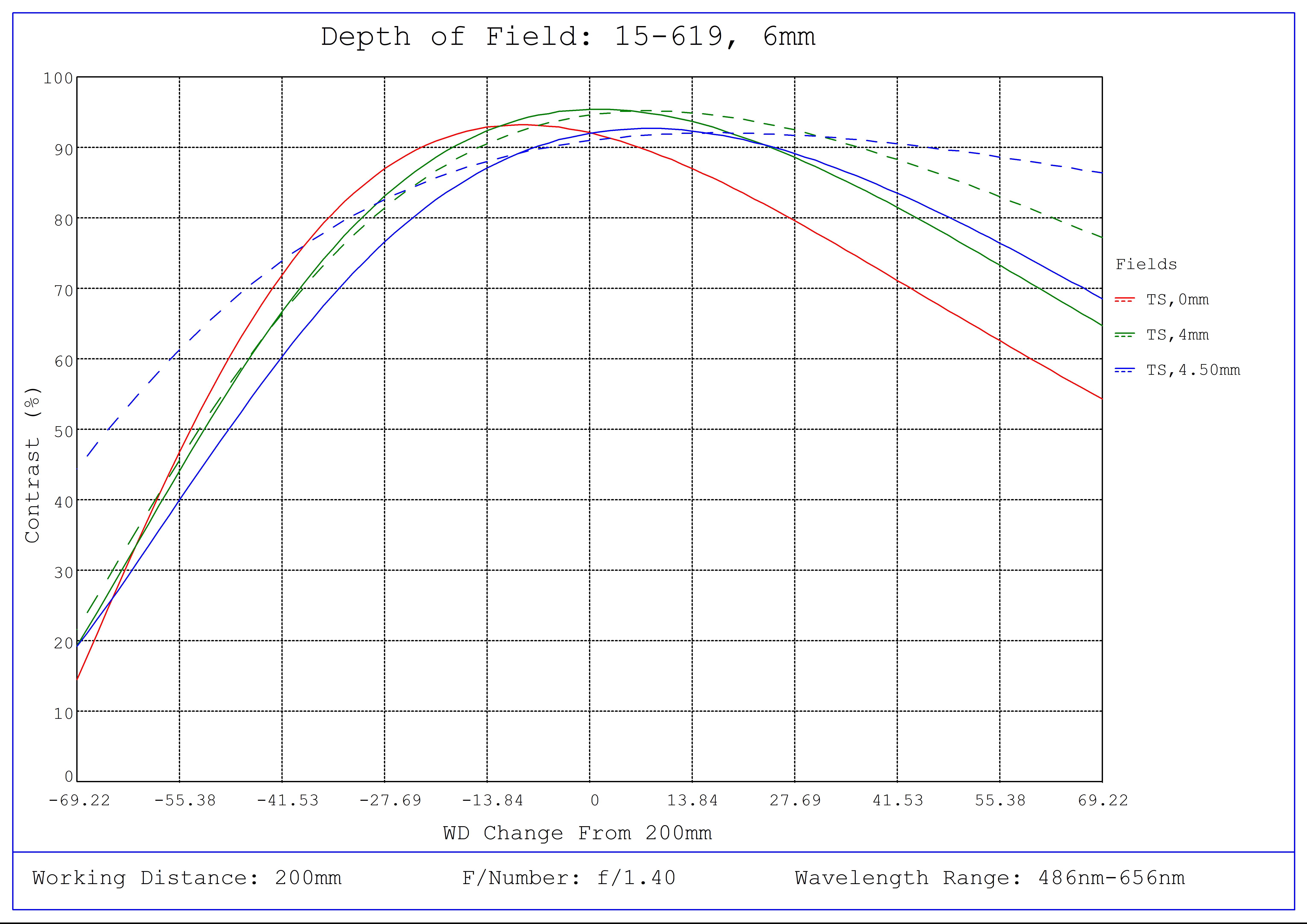 #15-619, 6mm, f/1.4 Cw Series Fixed Focal Length Lens, Depth of Field Plot, 200mm Working Distance, f1.4