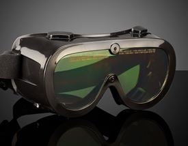 Laser Safety Goggles: Fit over prescription glasses and are vented to prevent fogging, with a standard "lab goggle" shape.
