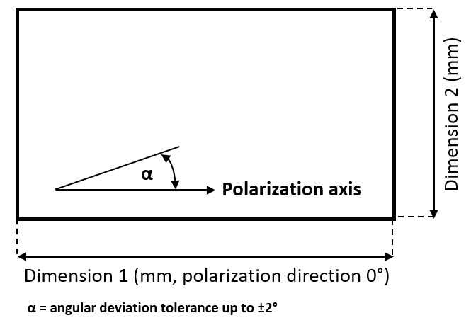 | The polarization direction is parallel to the first listed dimension. For example, a part sized 50 x 60 mm has a polarization direction is parallel to the 50mm edge. For square parts, polarization axis will be marked on the protective liner. For circular parts, polarization axis will be indicated by a notch cut into the polarizer edge |